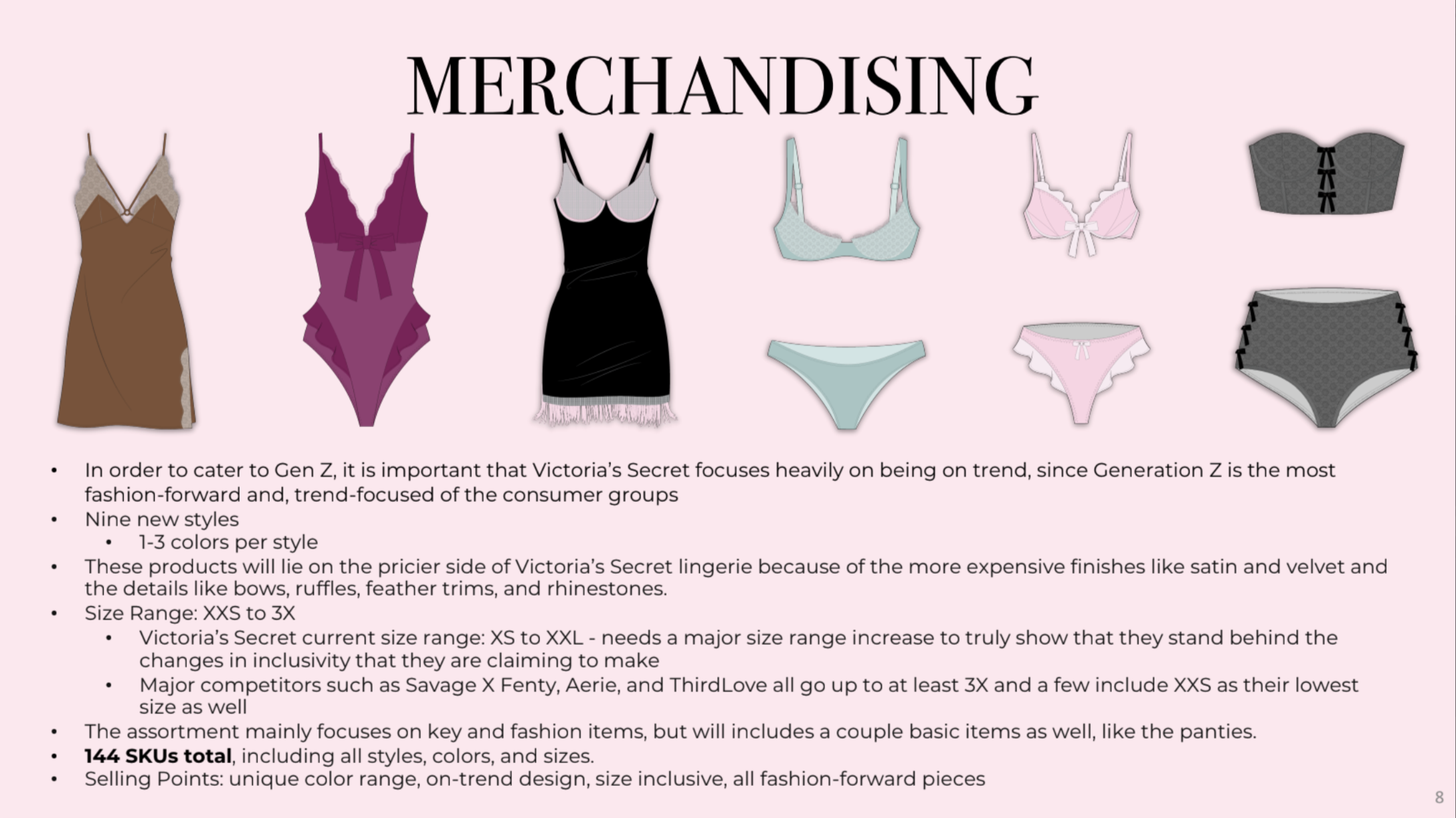 I was among the 100 recipients of the 2023 Fashion Scholarship Fund for my case study on Victoria’s Secret, which analyzed the brand's current challenges regarding its image, target consumer, and competitive landscape. The study also proposed a comprehensive merchandising and marketing strategy for leveraging livestream shopping to promote a new size-inclusive collection. As a winner of the 2024 FSF, I had the honor of being recognized by Anna Wintour and Karlie Kloss at the organization’s annual gala in New York City.